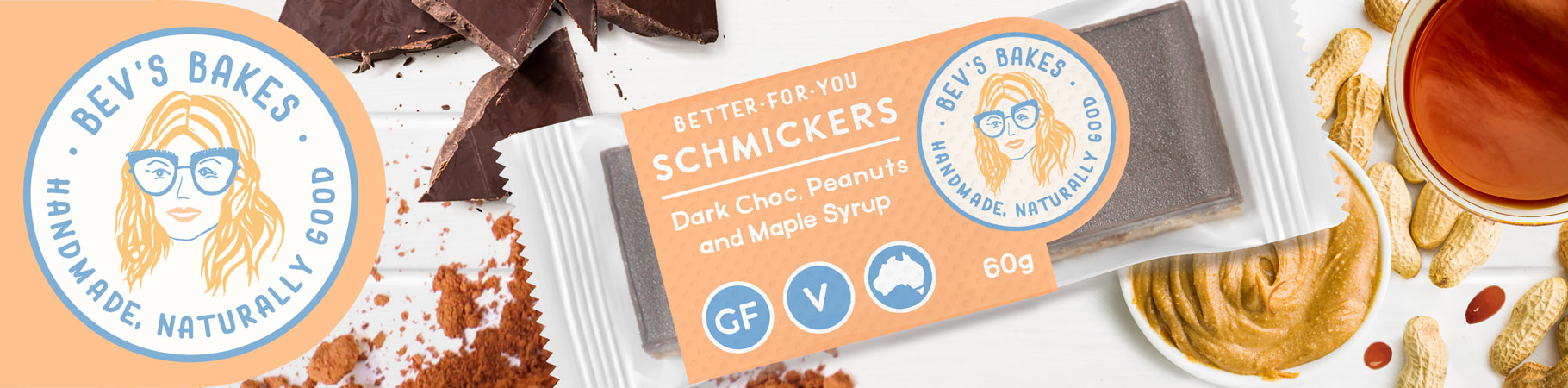 Schmickers is the perfect decadent blend of dark choc, peanuts, peanut butter, maple syrup with a hint of vanilla. A delicious raw, Gluten Free, Vegan Friendly slice handmade with no added colours or preservatives.